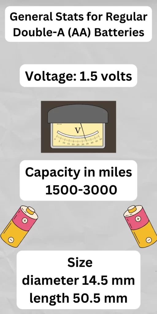 Keep in mind that these are just general stats and that the exact specifications of a particular AA battery may vary depending on the manufacturer and the specific product. It is always a good idea to consult the product packaging or manufacturer's website for specific information about a particular battery.