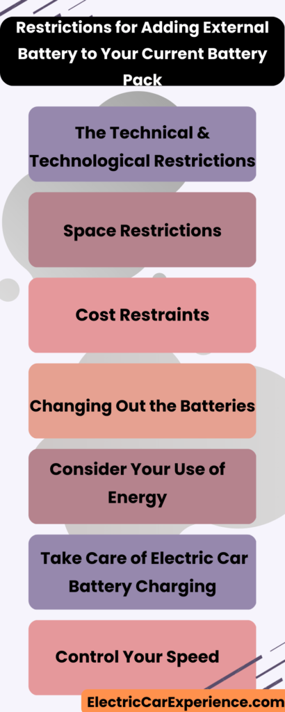 The following restrictions will apply if you attempt to add an additional external battery to your current battery pack because Electric car manufacturers do not provide their products with this feature: