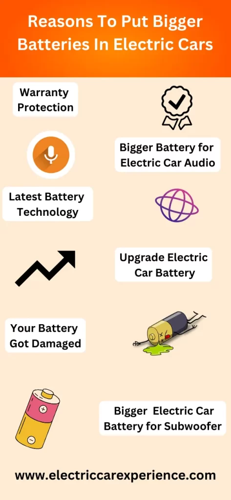 Yes, you can put a bigger battery in your electric car. Being able to go farther on a single charge and not having to worry as much about running out of power are two advantages of having a bigger battery. A bigger battery will increase the weight of your car, and the price will probably go up as well. Also, you can consider factors like how often I drive my electric car and how far I go.