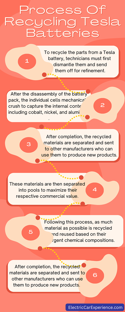 Around 10% of the battery’s weight will be reused by Tesla before the pack is sent out to be recycled. This includes the battery, its housing, and some electrical components. Kinsbursky Brothers (North America) and Umicore are the third companies that receive the batteries for further processing (Europe).