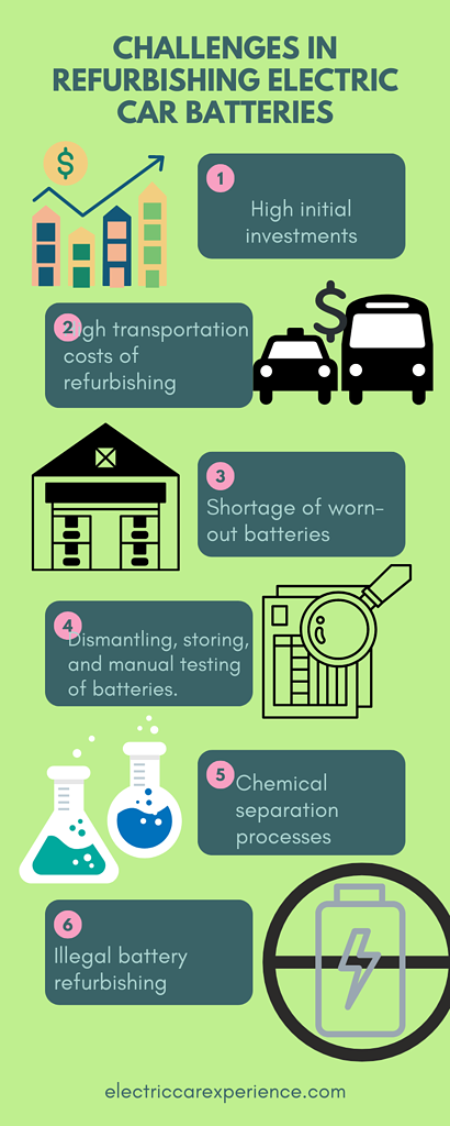 Refurbishing an Electric car battery is neither cheap nor simple. In addition, the refurbishment procedure requires a lot of work and resources and complex refurbishing logistics.