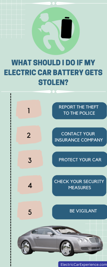 It is important to report the theft to the police and the insurance company as soon as possible. The insurance company may be able to cover the cost of replacing the battery, depending on the terms of the policy.