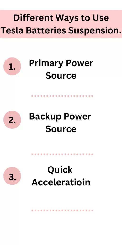 | Primary Power Source | One option is to use them as the primary power source for the suspension system. It means that the Tesla battery will entirely power the suspension system. It is a great option for those who want a completely green car. |