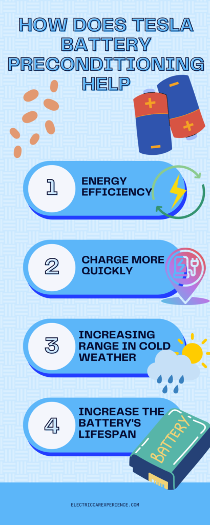 Maintaining your battery at a constant temperature during preconditioning also helps it last longer. The battery can be warmed up to help it last longer overall and guard against damage from high temperatures.