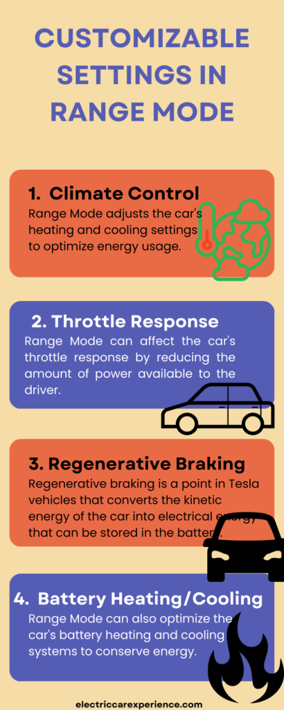 One of the benefits of Range Mode is that it allows drivers to customize the car’s settings to suit their specific driving requirements and preferences. In this section, we’ll take a near look at the customizable settings in Range Mode and how they can be used to help you get the most out of your Tesla.