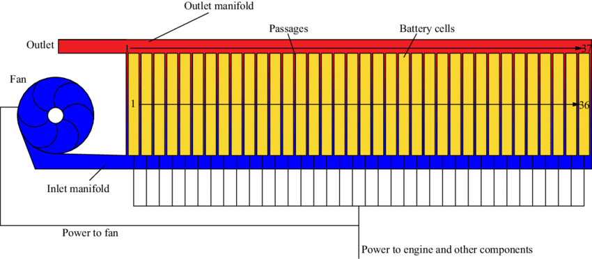 In active BTMS, there is fluid in motion. It is based on forced air. In some cars, fans are used to move or circulate fluid in the battery, and some cars have channels that are in direct contact with the cells in which cool air or fluid (water + ethylene glycol) is circulating.