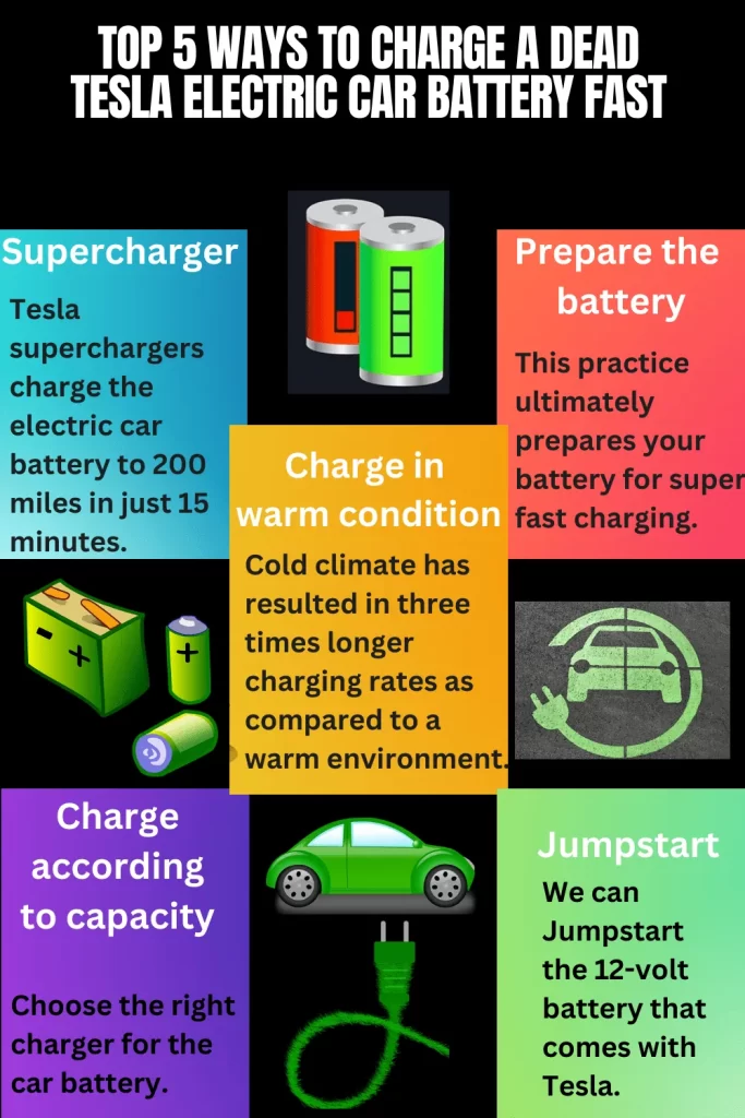 The top 5 ways to charge the dead Tesla car battery fast involve the use of superchargers, Jumpstart, Battery Preconditioning, Charging in Warm Conditions, and Charging according to the right capacity. Superchargers charge the electric car battery 25 times faster.