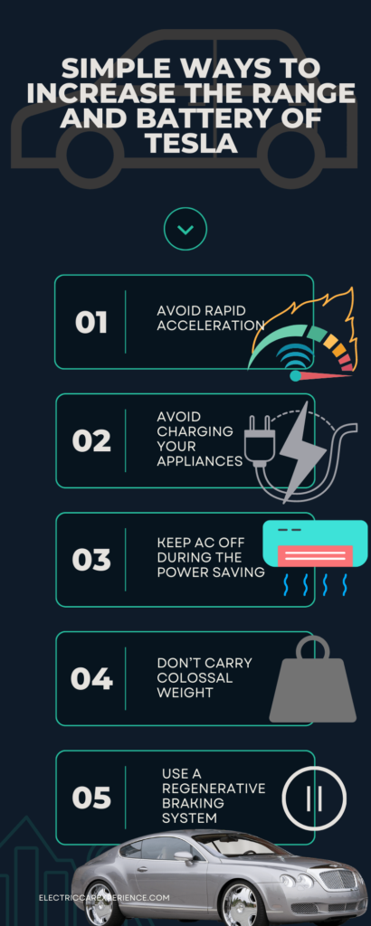 There are many ways to regain the range of Tesla cars. Some of the good ways to gain the range of Tesla are Avoiding rapid acceleration, keeping your Ac off, don’t charge any appliance through the Tesla battery, using regenerative braking, etc. However, we have given deep information to increase the range and battery of the Tesla above.